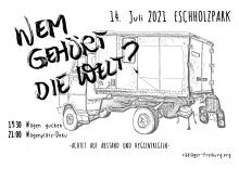 Das Wagenkollektiv Radlager öffnet am 14.7 um 1930 ein paar ihrer fahrbaren Zuhause, lädt zum Rumhängen ein (bitte beachtet die üblichen Hygiene Regeln) und zeigt um 2100 eine richtig knorke Doku über den Wagenplatz „Wem gehört die Welt?“.