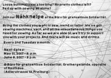 Nähkneipe Donnerstag, 12.10.17 um 20:00 Uhr Hose zu lang? Knopf ab? Keine schicken Klamotten mehr? Keine Lust alleine zu nähen? Grether-Gelände Büro für grenzenlose
