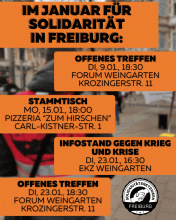VERSCHOBEN: Offenes Antifa Treffen Freiburg Freitag, 16.02.24 um 18:30 Uhr - Fr., 16.02.2024 - 20:30 Achtung: Im Februar findet das OAT ausnahmsweise am 3. Freitag statt! Ab März treffen wir uns wieder jeden 1. Freitag im Monat. Linkes Zentrum Freiburg (LiZ) Glümerstraße 2