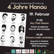 #Hanau Gedenken Freiburg - 4 Jahre Hanau Montag, 19.02.24 um 17:00 Uhr Gedenkkundgebung + Gesprächsveranstaltung Platz der Alten Synagoge