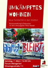 Umkämpftes Wohnen - Neue Solidarität in den Städten Samstag, 07.03.20 um 16:00 Uhr - Sa., 07.03.2020 - 18:00 Buchvorstellung mit dem Herausgeber Peter Nowak Stadtteilbüro Forum Weingarten