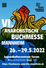 VI. Anarchistische Buchmesse in Mannheim Donnerstag, 26.05.22 um 00:00 Uhr - Sonntag, 29.05.22 um 00:00 Uhr 26. – 29. Mai 2022 ganz woanders Jugendkulturzentrum forum Mannheim