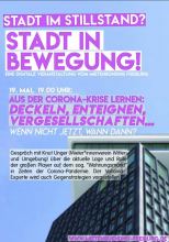 (online) Stadt im Stillstand - Stadt in Bewegung? Aus der Corona-Krise lernen: Deckeln, Enteignen, Vergesellschaften... Wenn nicht jetzt, wann dann? Dienstag, 19.05.20 um 19:00 Uhr - Di., 19.05.2020 - 20:30 Eine digitale Veranstaltung mit Knut Unger (Mieter*innenverein Witten und Umgebung) über die aktuelle Lage und Rolle der großen Player auf dem sogenannten "Wohnungsmarkt" in Zeiten der Corona-Pandemie. https://zoom.us/j/98536387079