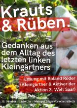 „Krauts & Rüben. Der letzte linke Kleingärtner“ Samstag, 13.10.18 um 18:00 Uhr - Sa., 13.10.2018 - 22:00 Lesung, Diskussion & Beisammensein mit Roland Röder (Aktion 3. Welt Saar) Weingut Andreas Dilger