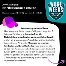 Awareness Einführungsworkshop Donnerstag, 08.12.22 um 18:30 Uhr - Do., 08.12.2022 - 20:30 Veranstaltung der Woke Weeks Block 1: Langfristig aktiv sein KTS - Kulturtreff in Selbstverwaltung (KaTS)