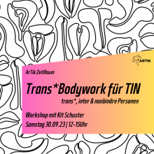 Trans*Body Workshop für TIN (trans*, inter und nichtbinäre Menschen) Samstag, 30.09.23 um 12:00 Uhr - Sa., 30.09.2023 - 15:00 ArTik // ZeitRaum