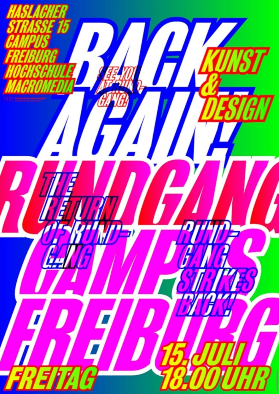 Freitag, 15.07.22 um 18:00 Uhr HKDM (jetzt Macromedia) In der Haslacherstr. 15 zeigen Studierende aus den Bereichen Kunst und Design ihre Semester-Arbeiten. Rundgang - Campus Freiburg Type of Event Ausstellung Inhaltliche Veranstaltung Kultur