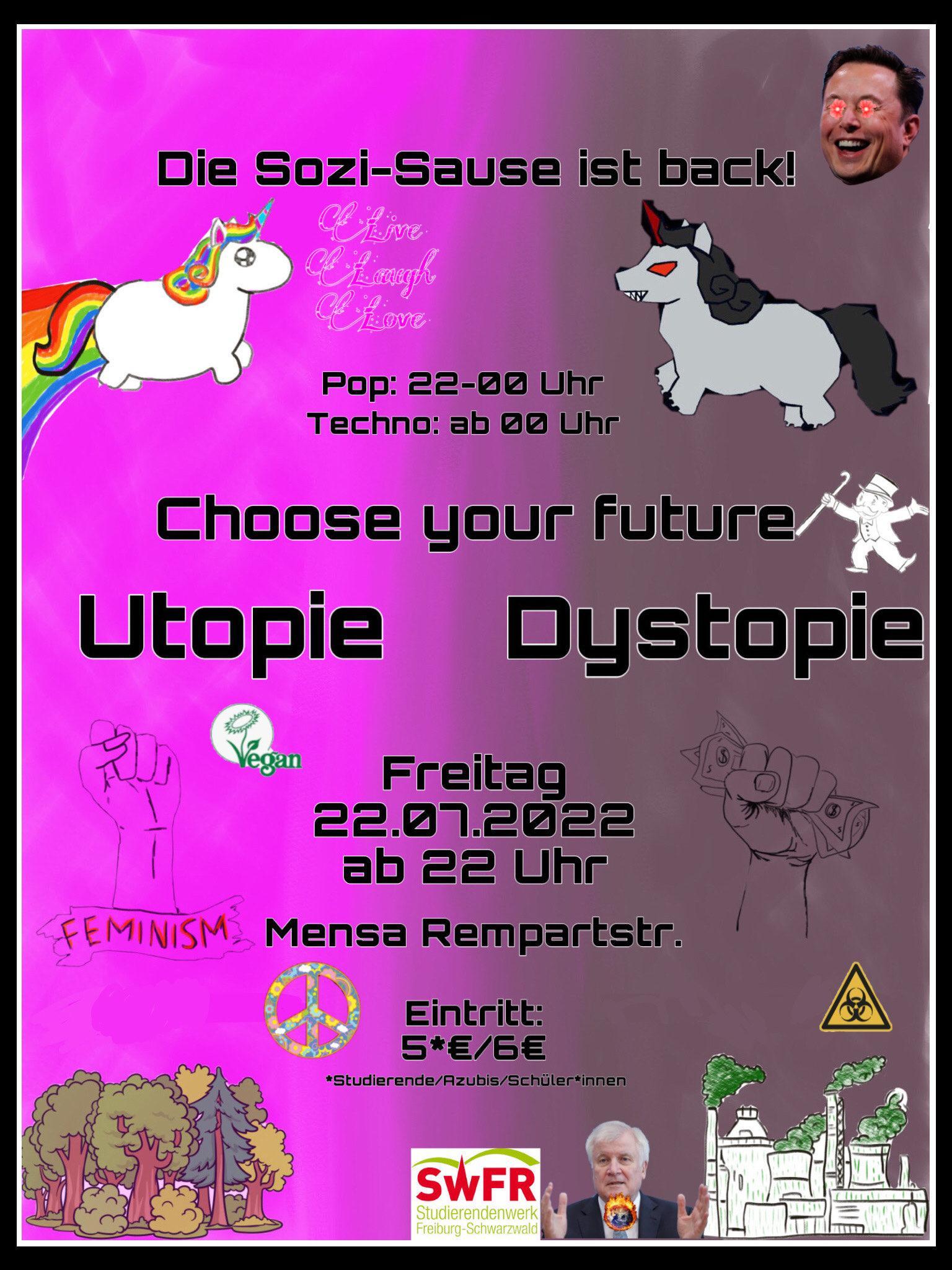 Nach zwei Jahren Pause ist es endlich wieder soweit – am 22.07. wird die legendäre Sozi-Sause unter dem Motto „Utopie und Dystopie“ wiederbelebt.
