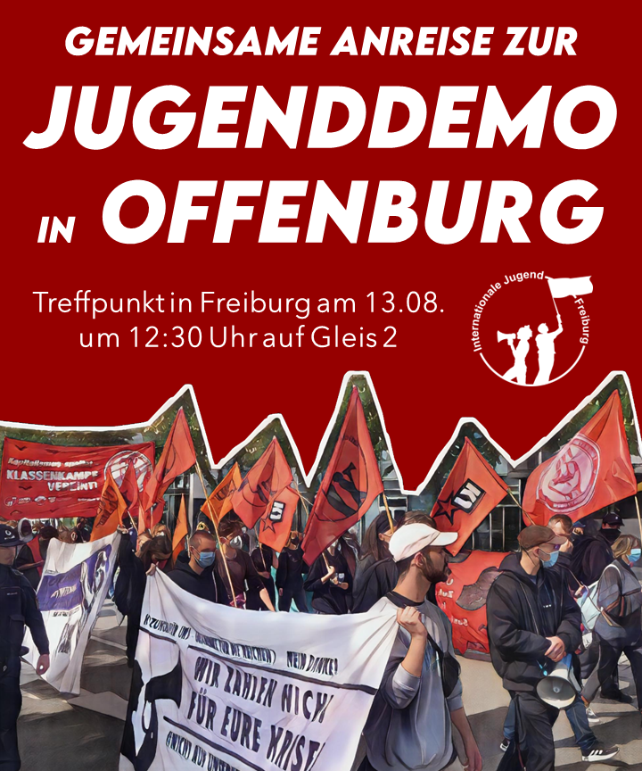 Wir werden am Samstag, den 13.08., zur Jugenddemo nach Offenburg anreisen. Wenn ihr euch anschließen möchtet kommt einfach um 12:30 Uhr auf Gleis 2 oder schreibt uns vorher gerne