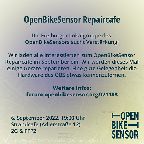 Dienstag, 06.09.22 um 19:00 Uhr Strandcafé Adlerstraße 12 79098 Freiburg im Breisgau Deutschland Show map Adlerstr. 12 https://forum.openbikesensor.org/t/freiburg-obs-repaircafe-im-strandi-september-2022/1188 Café im Strandcafé auf dem Grethergelände Type of Event Support & DIY Workshop Organization Chaos Computer Club Freiburg