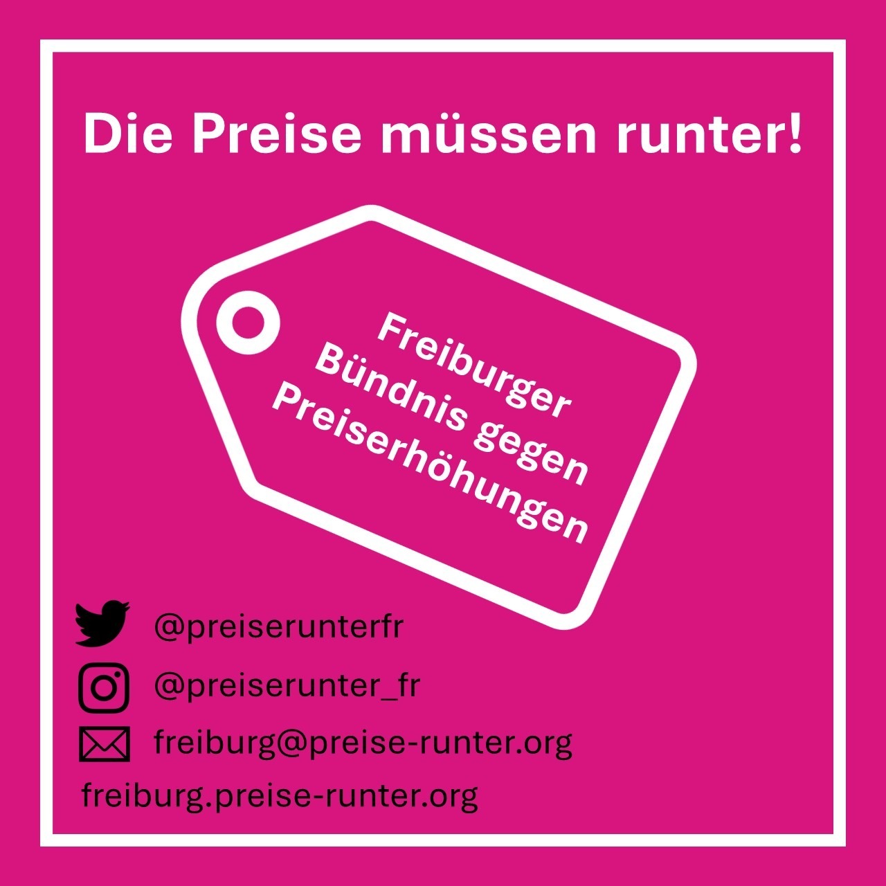 Essen, Wohnen, Energie, Mobilität - das Leben wird für viele Menschen zunehmend unbezahlbar. So kann es nicht weitergehen, die Preise müssen runter! Deshalb haben wir das Bündnis "Preise Runter! Freiburg" gegründet. Gemeinsam kämpfen wir für ein gutes Leben für alle! Gerne könnt ihr euch uns anschließen, dafür wollen wir euch hiermit herzlich zu unseren Bündnisplena einladen. Wir treffen uns jeden zweiten Dienstag (nächster Termin: 13. September) um 20 Uhr am Rasthaus im Grethergelände. Schaut doch einfach mal vorbei und gestaltet mit, wir freuen uns auf euch!