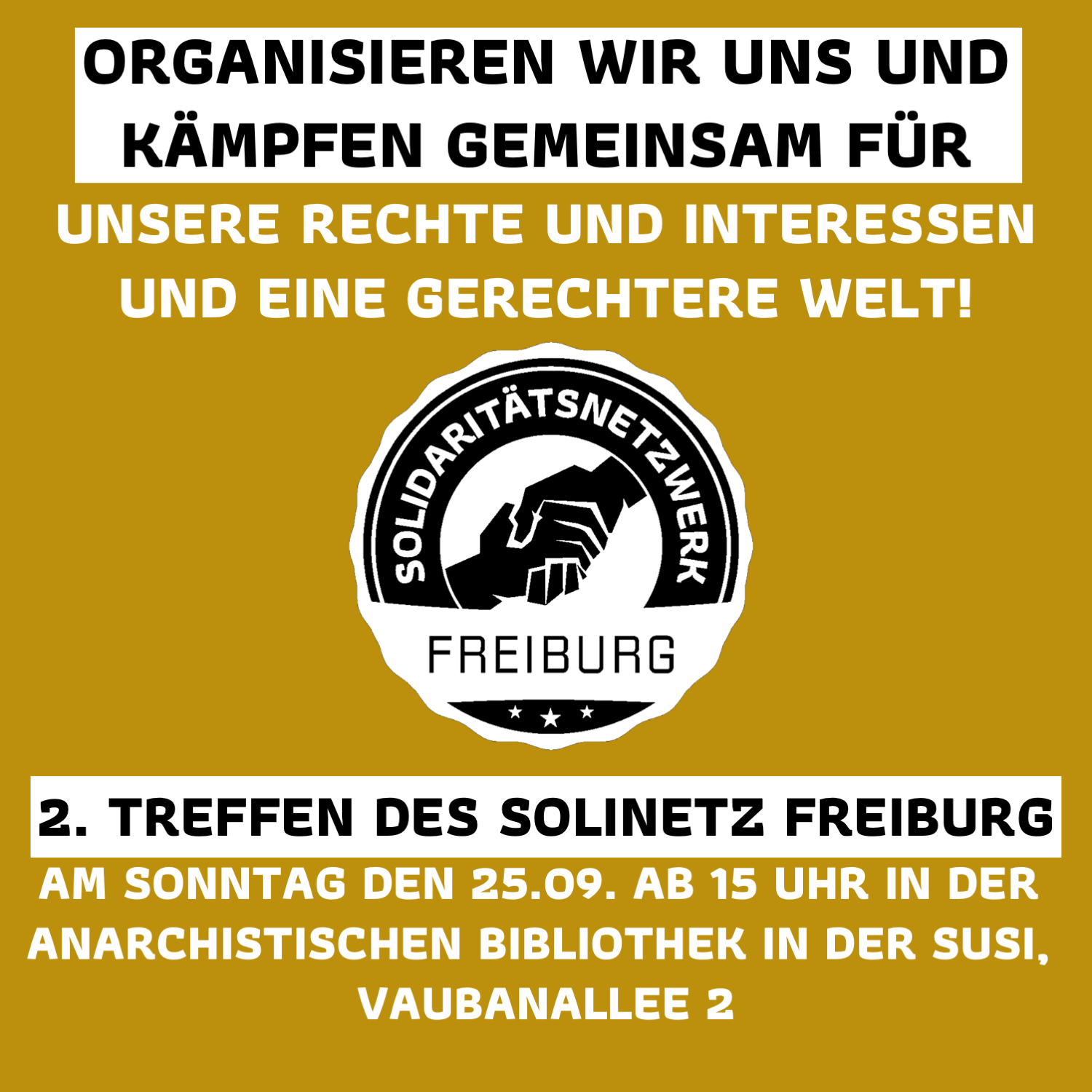Am Sonntag, den 25.09., laden wir vom Solidaritätsnetzwerk Freiburg ab 15 Uhr zu unserem 2. Treffen in die Anarchistische Bibliothek in der Vaubanallee 2 ein.