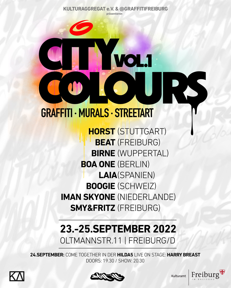 Das CITY COLOURS-Festival geht in die erste Runde! Von Freitag bis Sonntag, 23.-25.09.22, laden das kulturaggregat und @graffitifreiburg acht hochkarätige, internationale Artists aus den Bereichen Graffiti & Mural nach Freiburg ein.