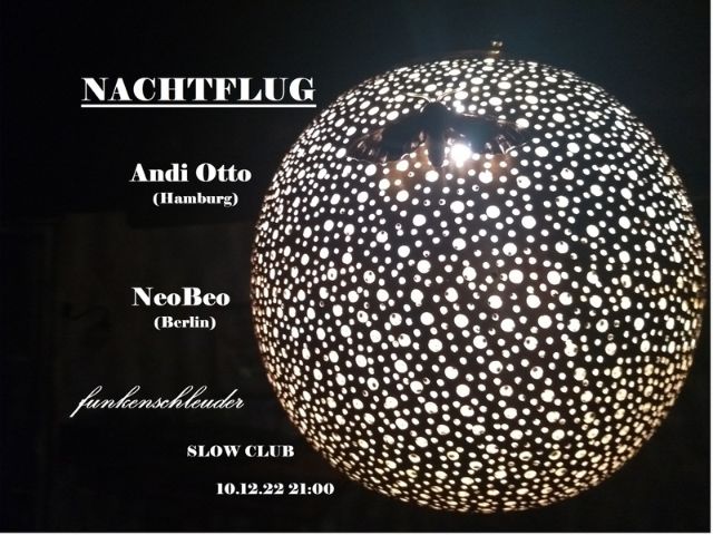 Der dritte Nachtflug rauscht heran und bietet wie gewohnt ein vielfältiges Programm verschiedener Spielarten elektronischer Tanzmusik. An diesem Abend zu Gast sind ANDI OTTO aus Hamburg, mit einem fulminanten Live Concert und NEOBEO aus Berlin mit einem DJ Set der Extraklasse. FUNKENSCHLEUDER wird zu Beginn die Passagiere in die Nacht geleiten….