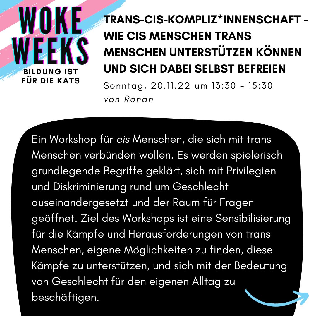 Ein Workshop für cis Menschen, die sich mit trans Menschen verbünden wollen. Es werden spielerisch grundlegende Begriffe geklärt, sich mit Privilegien und Diskriminierung rund um Geschlecht auseinandergesetzt und der Raum für Fragen geöffnet. Ziel des Workshops ist eine Sensibilisierung für die Kämpfe und Herausforderungen von trans Menschen, eigene Möglichkeiten zu finden, diese Kämpfe zu unterstützen und sich mit der Bedeutung von Geschlecht für den eigenen Alltag zu beschäftigen, da die Befreiung von Patriarchat und Geschlechternormen uns allen zugute kommt, egal ob cis oder trans.
