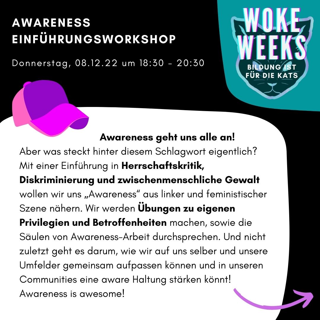 Awareness geht uns alle an! Aber was steckt hinter diesem Schlagwort eigentlich? Mit einer Einführung in Herrschaftskritik, Diskriminierung und zwischenmenschliche Gewalt wollen wir uns „Awareness“ aus linker und feministischer Szene nähern. Wir werden Übungen zu eigenen Privilegien und Betroffenheiten machen, sowie die Säulen von Awareness-Arbeit durchsprechen. Und nicht zuletzt geht es darum, wie wir auf uns selber und unsere Umfelder gemeinsam aufpassen können und in unseren Communities eine aware Haltung stärken könnt! Awareness is awesome!