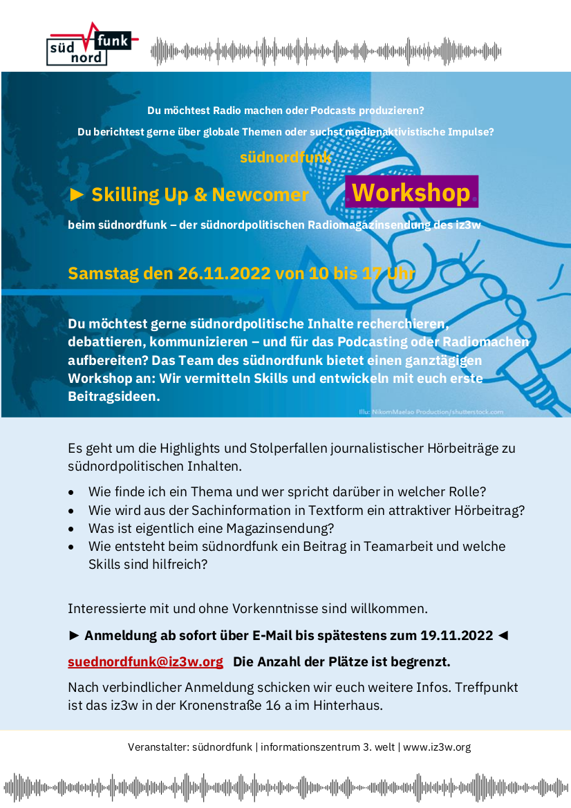 ► Anmeldung ab sofort per E-Mail bis zum 21.11. ► suednordfunk@iz3w.org Die Anzahl der Plätze ist begrenzt.