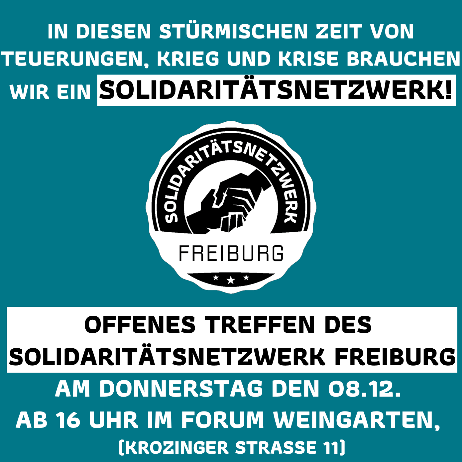 Dann komm am 8.12. ab 17:30 zum Offenen Treffen des Solidaritätsnetzwerk Freiburg im Forum Weingarten in der Krozinger Straße 11. Gemeinsam wollen wir uns in solidarischer Athmosspähre beraten, wie wir für unsere Rechte und Interessen und eine gerechtere Welt kämpfen können