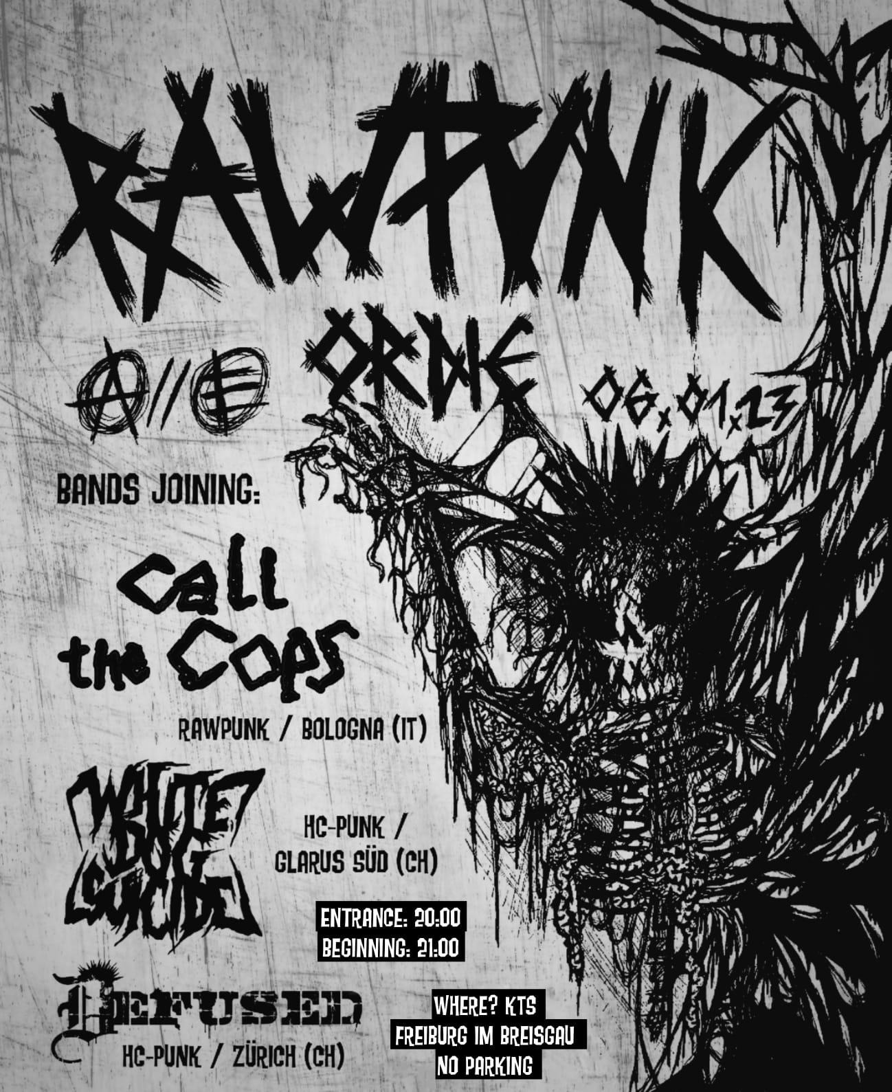 Raw Punk or die! Unter diesem Namen findet am Freitag den 06.01.2023 ein Hardcore- und Raw Punk Konzert in der KTS statt. Tanzt, singt, pogt und trinkt mit uns aufs neue Jahr! Mit dabei sind die Harcore Punk Bands White Dog Suicide und Defused aus der Schweiz. Als Headliner des Abends spielen Call the Cops, Raw Punk aus Italien. Wir freuen uns Call the Cops und White Dog Suicide wieder einmal bei uns begrüßen zu dürfen und Defused das erste Mal dabei zu haben!