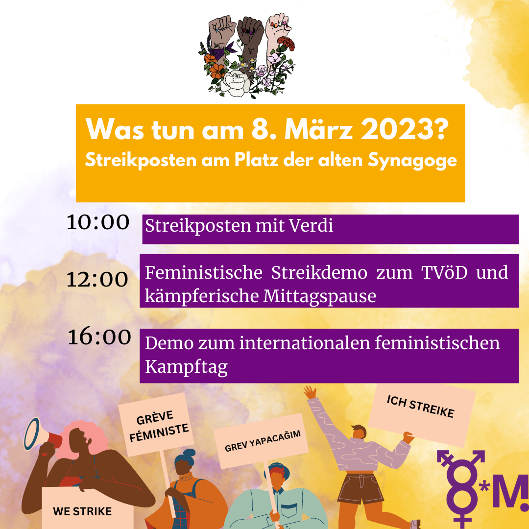 Am 8. März werden wir von 10-14 Uhr mit einem Infostand auf dem Platz der alten Synagoge sein und dort den Streik sichtbar machen. Der Infostand soll als zentraler Streikposten und Ort für Austausch dienen. Um 12 Uhr wird eine Streikdemonstration mit kämpferischer Mittagspause stattfinden. Anschließend findet ab 16 Uhr die allgemeine, internationale Demonstration zum Feministischen Kampftag, den 8.März statt.