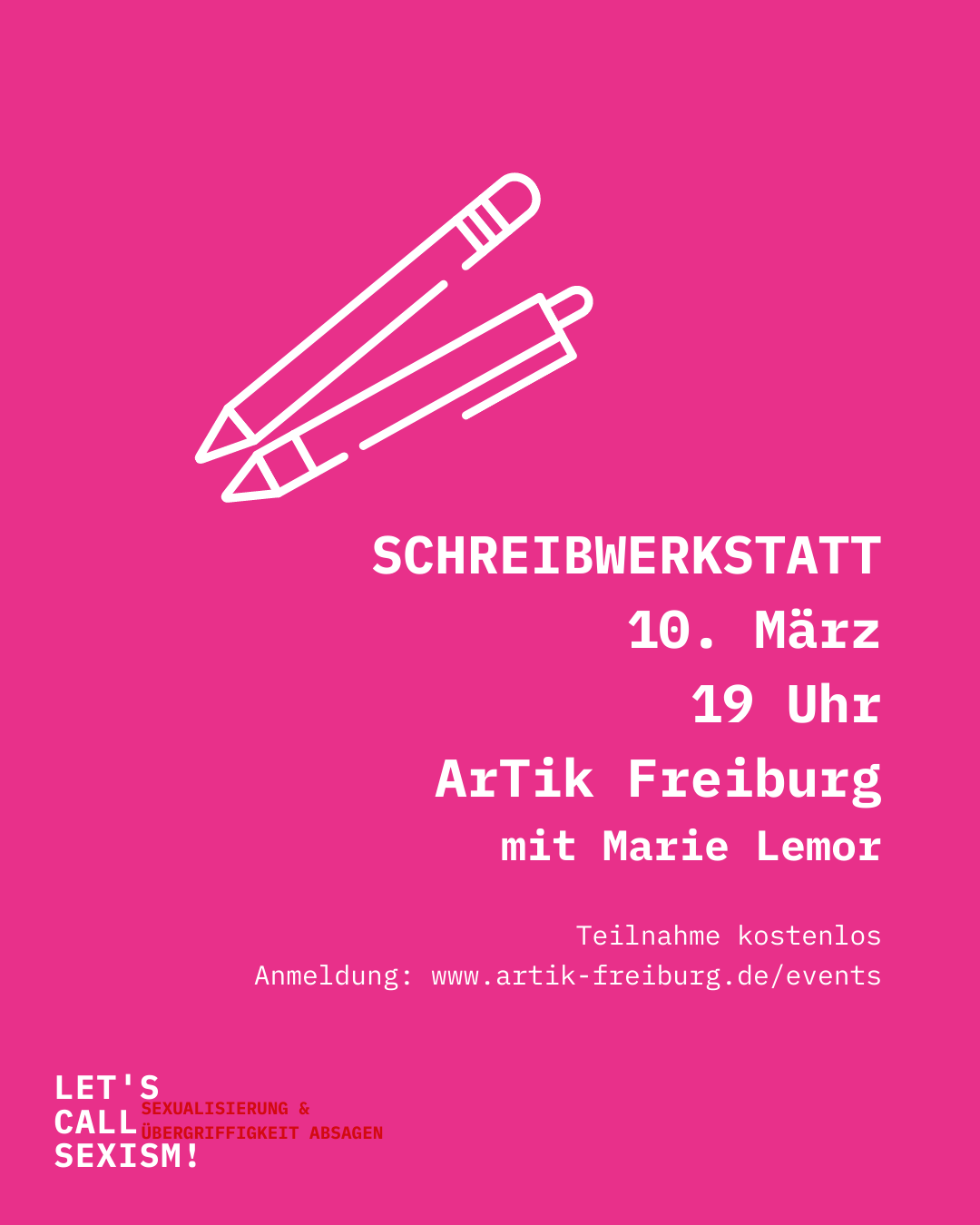 Wie kann ich mit dem kreativen Schreiben beginnen, persönliche Themen bearbeiten, einen Text rund machen und ihn vielleicht sogar vortragen? Dem kannst du dich in der Schreibwerkstatt mit Marie Lemor nähern, ausprobieren und ins Schreiben kommen. Egal ob Lyrik, Prosa, Comedy oder Erzählung – all das hat Platz. Denn gemeinsam haben wir ein Ziel: Übergriffigkeit und Sexualisierung absagen. Die Teilnahme ist kostenlos, der Workshop wird circa 90 Minuten dauern. Die Teilnahmezahl ist begrenzt, daher wird um Anmeldung gebeten.