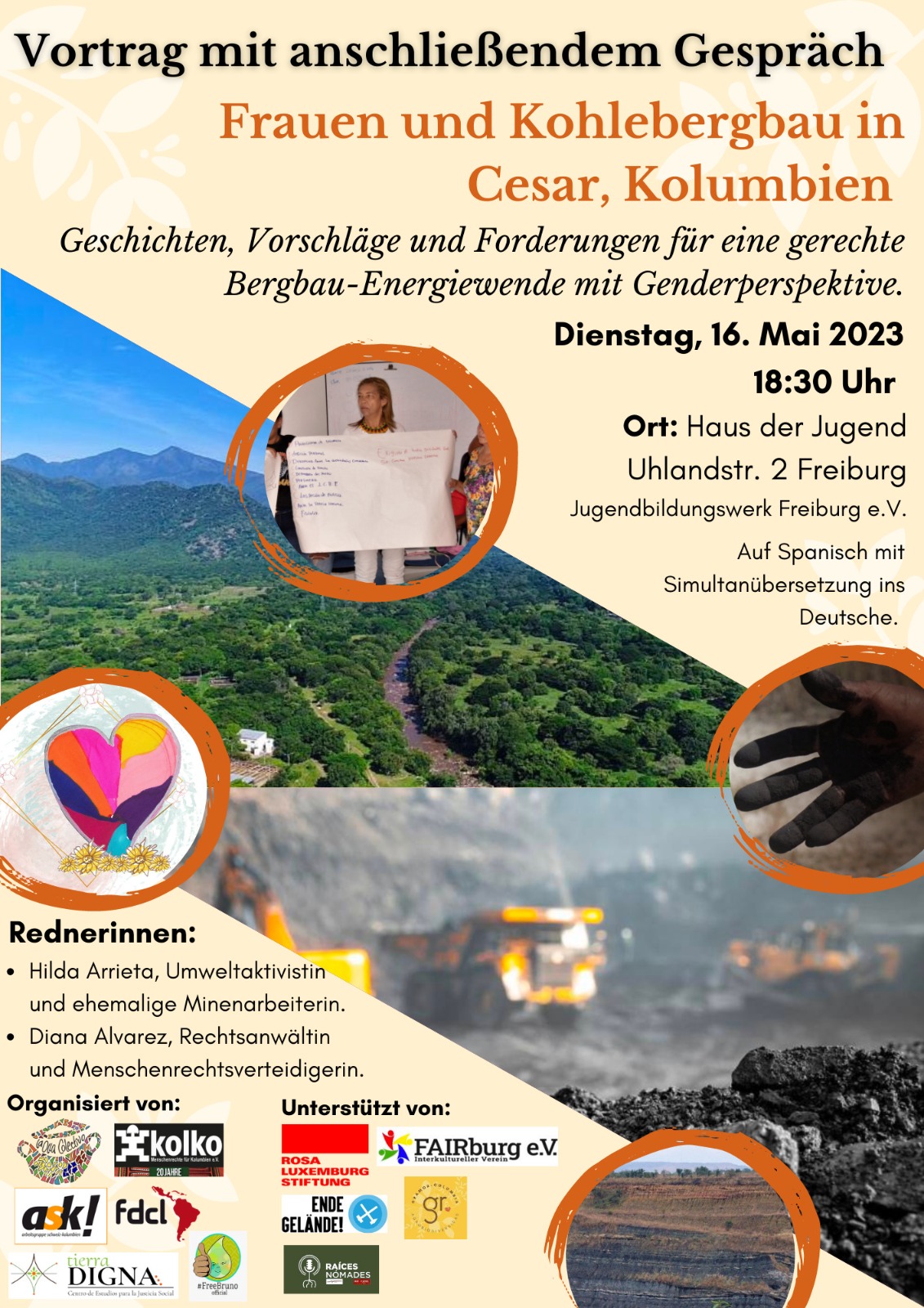 En su visita a Freiburg, Hilda Arrieta, lidereza y ex-trabajadora de una mina de carbón en el César y Diana Alvarez, abogada y defensora de derechos humanos, contribuirán a esta discusión desde su experiencia y conocimiento alrededor de las minas Calenturitas y Jagua (operadas por la empresa suiza GLENCOR); minas que al 2019 producían el 65% de carbón exportado en Colombia y que hoy se encuentra en fase de cierre.