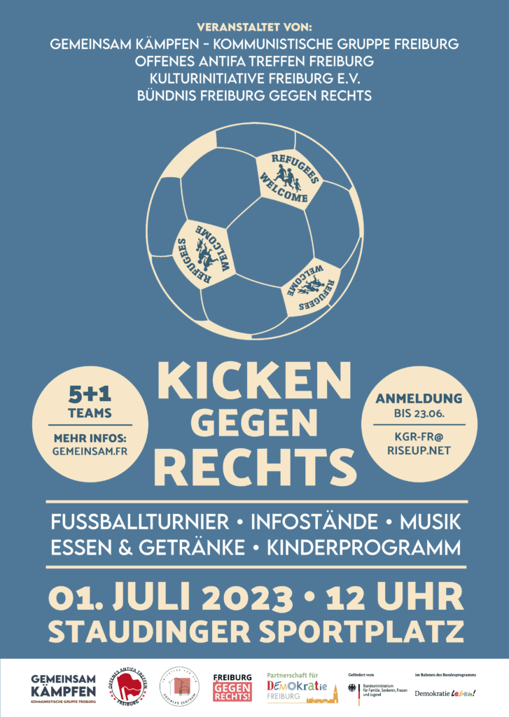 Wir, Gemeinsam Kämpfen - Kommunistische Gruppe Freiburg, das Offene Antifa Treffen Freiburg, das Bündnis Freiburg gegen Rechts und die Kulturinitiative Freiburg e.V. laden am 1. Juli zum Kicken gegen Rechts 2023 in Freiburg ein!