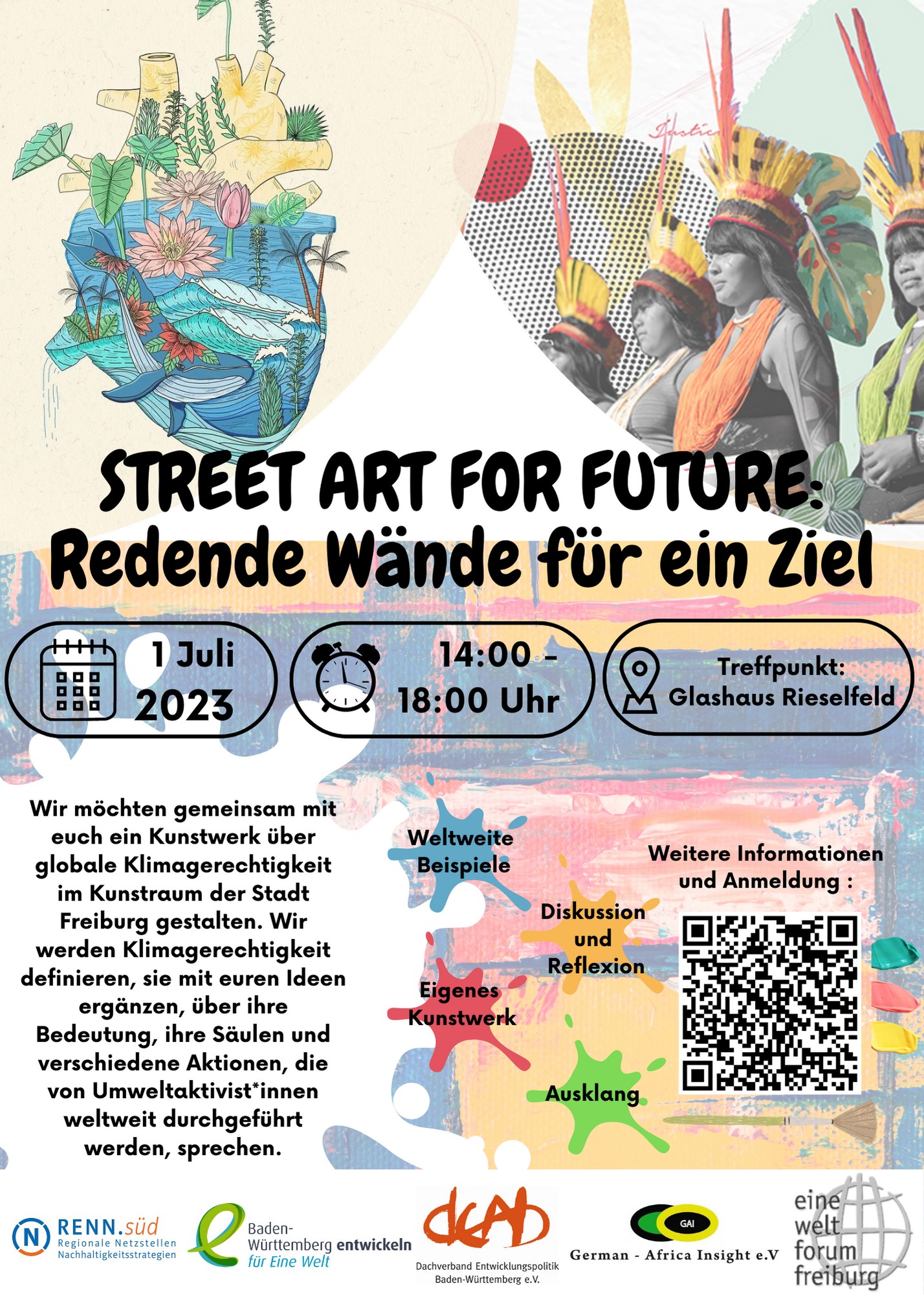 Wir möchten gemeinsam mit euch ein Kunstwerk über globale Klimagerechtigkeit im Kunstraum der Stadt Freiburg gestalten. Wir werden Klimagerechtigkeit definieren, sie mit euren Ideen ergänzen, über ihre Bedeutung, ihre Säulen und verschiedene Aktionen, die von Umweltaktivist*innen weltweit durchgeführt werden, sprechen.