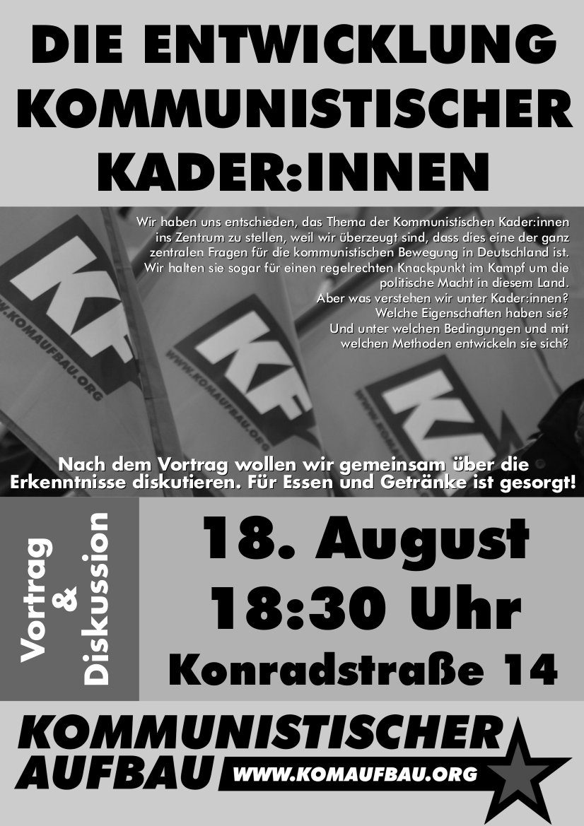 Wir haben uns entschieden, das Thema der Kommunistischen Kader:innen bei unserem diesmonatigen Vortrag ins Zentrum zu stellen, weil wir überzeugt sind, dass dies eine der ganz zentralen Fragen für die kommunistische Bewegung in Deutschland ist.