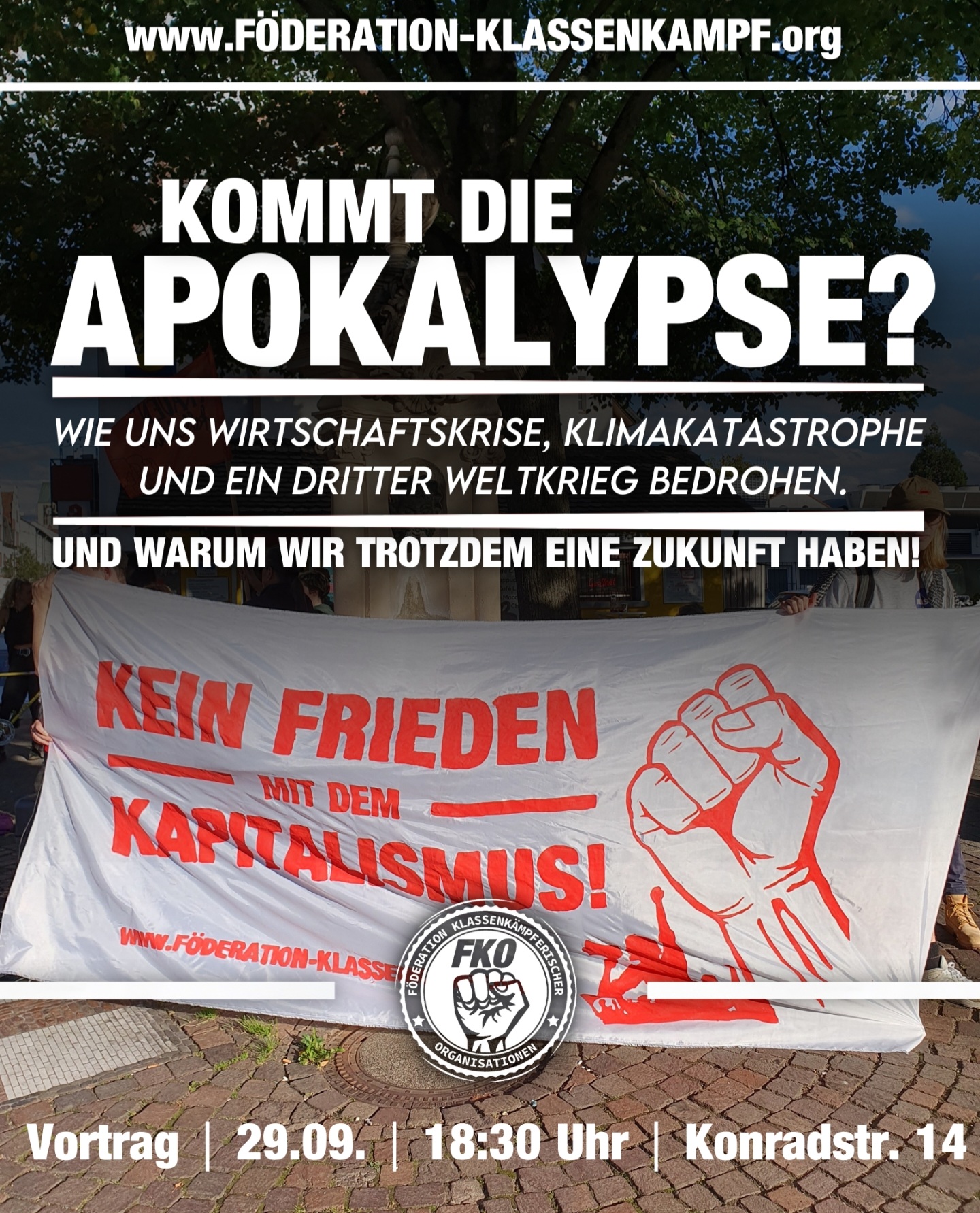 In unserem Vortrag möchten wir aufzeigen, warum einerseits zwar Krisen, Katastrophen und Kriege im Kapitalismus gesetzmäßig auftreten. Wir wollen aber auch darüber sprechen, warum es falsch wäre den Kopf in den Sand zu stecken und wie eine hoffnungsvolle Antwort und Alternative aussehen kann.