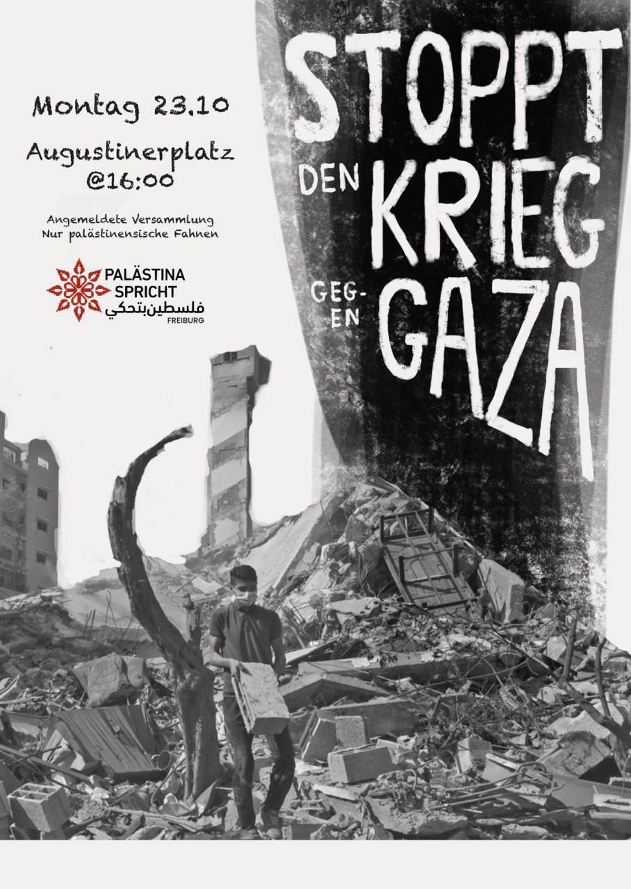Montag, 23.10.23 um 16:00 Uhr Augustinerplatz Augustinerplatz 79098 Freiburg im Breisgau Deutschland Show map Links https://www.instagram.com/p/CynhOZkMc7d/?igshid=MTc4MmM1YmI2Ng%3D%3D&img_index=1 Themen Krieg und Militarisierung Soziale Kämpfe Transnationale Solidarität Type of Event Inhaltliche Veranstaltung Kundgebung