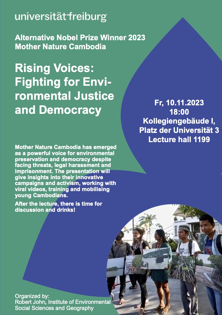 Es geht um eine Diskussionsveranstaltung am Freitag, 10. November um 18 Uhr, die von Robert John, Doktorand in der Geographie in Freiburg, organisiert wird. Er hat im Rahmen seiner Promotion zu Marketization von Sand am Fallbeispiel Kambodscha mit Mother Nature, einer Gruppe Umweltaktivist*innen in Kambodscha, eng zusammen gearbeitet. Nun hat Mother Nature den alternativen Nobelpreis (Right Livelihood Award) gewonnen und auf dem Weg zur Verleihung in Stockholm machen einige Aktivist*innen Halt in Freiburg.