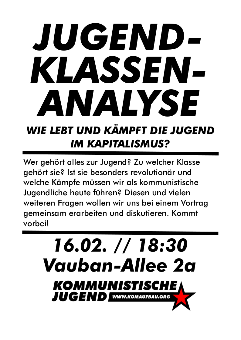 Mit diesen und weiteren Fragen hat sich die Kommunistische Jugend in ihrer neuen Broschüre beschäftigt. Am 16.02. will sie ihre Erkenntnisse mit euch teilen und diskutieren. Schaut vorbei.