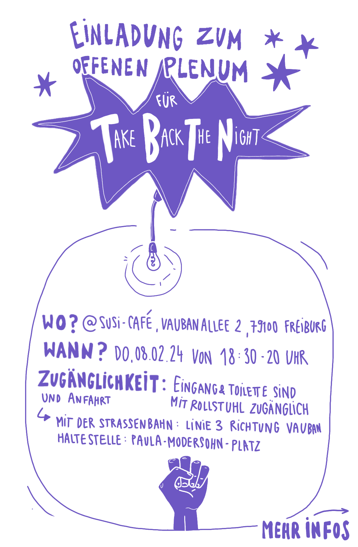 Mit Take Back The Night wollen wir uns Räume zurücknehmen, in denen wir uns oft nicht sicher und frei fühlen können. Momentan ist noch offen, wie genau das dieses Jahr aussehen wird. Daher suchen wir Menschen, die Lust haben gemeinsam diese Nacht zu gestalten, gemeinsam zu lernen, sich zu bestärken und uns unseren Raum zu nehmen.