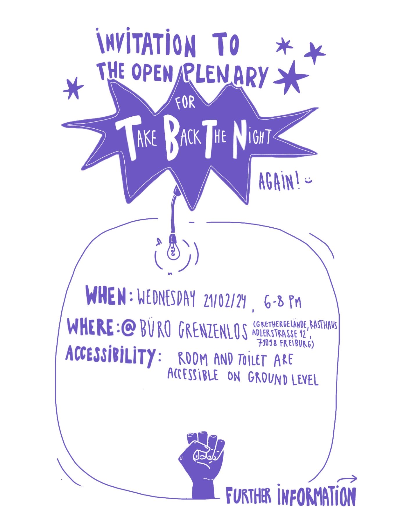 We would like to invite you to our open planning meeting (plenary) for the night of 30 April to 1 May (Take Back The Night). Since the 70s, this night has been a night that stands for reclaiming the streets and the darkness in feminist contexts. With Take Back The Night, we want to take back spaces in which we often cannot feel safe and free. At the moment, it is still unclear what exactly this will look like this year. We are therefore looking for people who would like to organise this night together, learn together, empower each other and take back our space. This year, we want to open up the organisation to all people who cannot move around safely in all places. Be it at night on the streets, in the park, but also during the day on buses and trains, in contact with public authorities and other state institutions, as well as in private contexts in partnerships, residential facilities and families. Our open plenary will take place on Thursday, 21/02/2024 at 6.00 AM. The location is at Grenzenlos on the Grethergelände. It is locates right across from Saga (Adlerstraße 12). The plenary room and toilet are accessible for wheelchair users. If you don’t have time on this date, but would like to come, please send us an email to tbtn.fr@systemli.org. The plenary session will be held in German. English whispered translations are possible. If you need anything to be able to come to the plenary (accompaniment to the plenary, ...) or have other topics and questions, please contact tbtn.fr@systemli.org. Feel free to share the call! We are looking forward to seeing you! ?