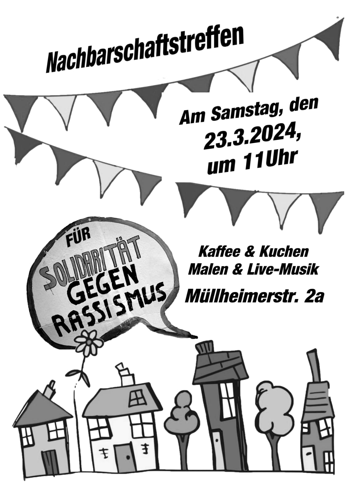 Wir sind eine Gruppe von Nachbar:innen, die sich zusammengefunden haben, um etwas gegen die rassistischen Sticker, die hier in der Siedlung immer wieder auftauchen, zu machen. Wir wollen einen Beitrag dazu leisten, dass sich die Menschen hier im Schildacker kennen, einander unterstützen und kein Platz für Rechte Hetze ist. Dafür möchten wir alle Anwohner:innen und interssantierten Menschen zu einem zu einem Nachbarschaftstreffen am Samstag, den 23.03., ab 11 Uhr in der Einfahrt auf Höhe der Mühlheimerstraße 2a einladen. Es wird Kaffee, Kuchen und Live-Musik geben, außerdem wollen wir gemeinsam ein Transparent malen. Wir freuen uns, wenn Menschen Lust haben mitzumusizieren :)