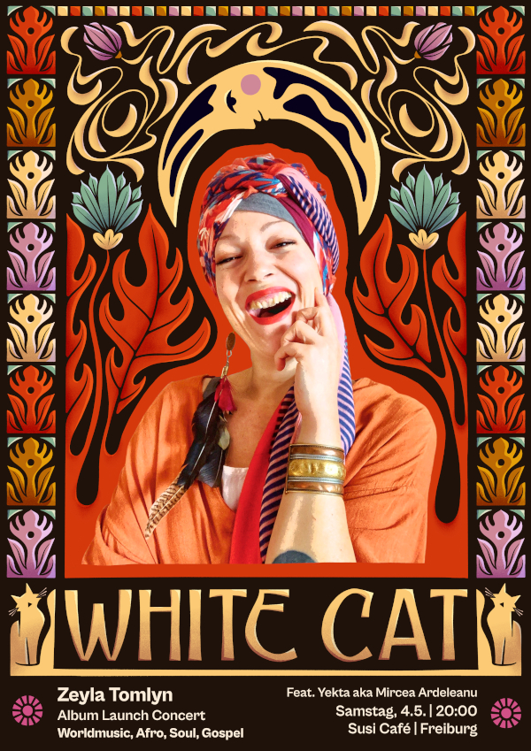 Ihr neues Album WHITE CAT spiegelt ihre Liebe zur Afrikanischen Musik, dem Soul und der Worldmusic, all das in einem lebhaften Mix aus akkustischer und elektronischer Musik, live Instrumenten und selbstproduzierten backing Tracks.