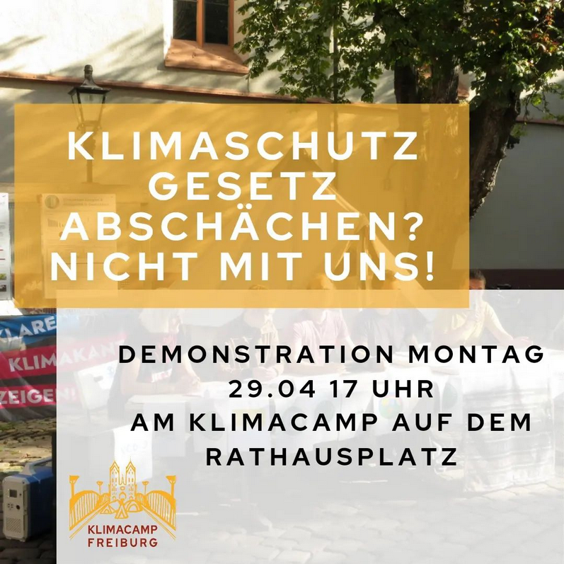 Die Ampel hat das Klimaschutzgesetz am 15.4 durch die Abschaffung der Sektorenziele massivst aufgeweicht und somit zukünftige Generationen in Ihren Rechten beschnitten und wahrscheinlich Strafzahlungen an die EU in Milliardenhöhe zu verantworten. Dagegen demonstrieren wir am 29.4 17 Uhr am Klimagerechtigkeitscamp auf dem Rathausplatz.