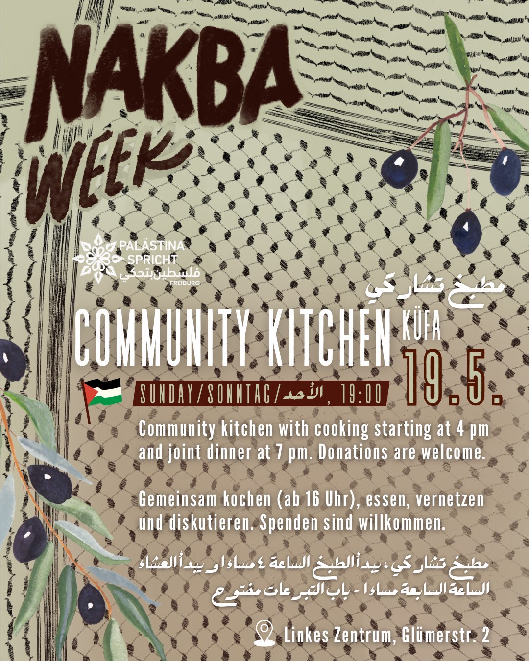 Am 15. Mai gedenken wir wie jedes Jahr der Nakba - der Vertreibung und Ermordung von Palästinenser*innen, die von 1948 bis heute andauert. Dafür haben wir eine ganze Aktionswoche organisiert. Alle Veranstaltungen findet ihr hier auf tacker, auf Instagram, Telegram und auf unserer Website. Wir laden Einzelpersonen und Gruppen, die sich für unsere Sache interessieren, ein, uns bei so vielen dieser Veranstaltungen wie möglich zu begleiten. Besonders in der Woche, in der wir uns an die Nakba erinnern, und in einer Zeit, in der die Menschen im Gazastreifen weiterhin vertrieben und bombardiert werden, ist es entscheidend, dass wir zusammenkommen und uns vereinen – gegen Völkermord, gegen Vertreibung, für Befreiung und Gerechtigkeit!