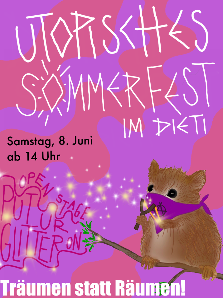 Anfang Juni wollen wir im Dieti zum Utopischen Sommerfest einladen, gemeinsam bunt und vielfältig zusammen kommen, den Dieti feiern und Utopie träumen! ?