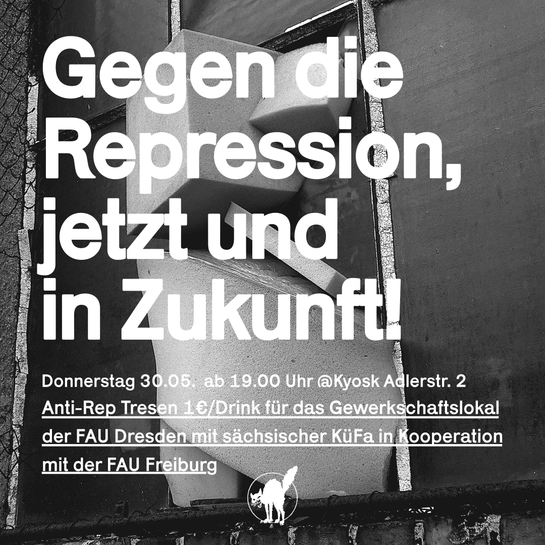 Gerade mit Blick auf die kommenden Kommunal-, Landtags- und Europawahlen und die erwartete große Mehrheit rechter und nationalistischer Parteien im sächsischen Landtag und den Gemeinderäten muss damit gerechnet werden, dass linke, soziale und progressive Akteur*innen noch stärkere Repression erfahren werden. Das Gewerkschaftslokal unterstützt die FAU Dresden und anderen Gruppen, widerständig und handlungsfähig zu bleiben.