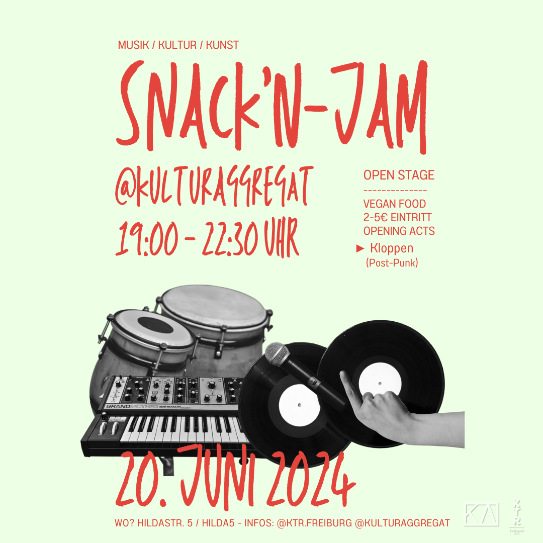Jammsession mit Opening Acts. Dabei gibt es immer wechselnde vegane Gerichte an der Bar für wenig Geld oder auf Spendenbasis.