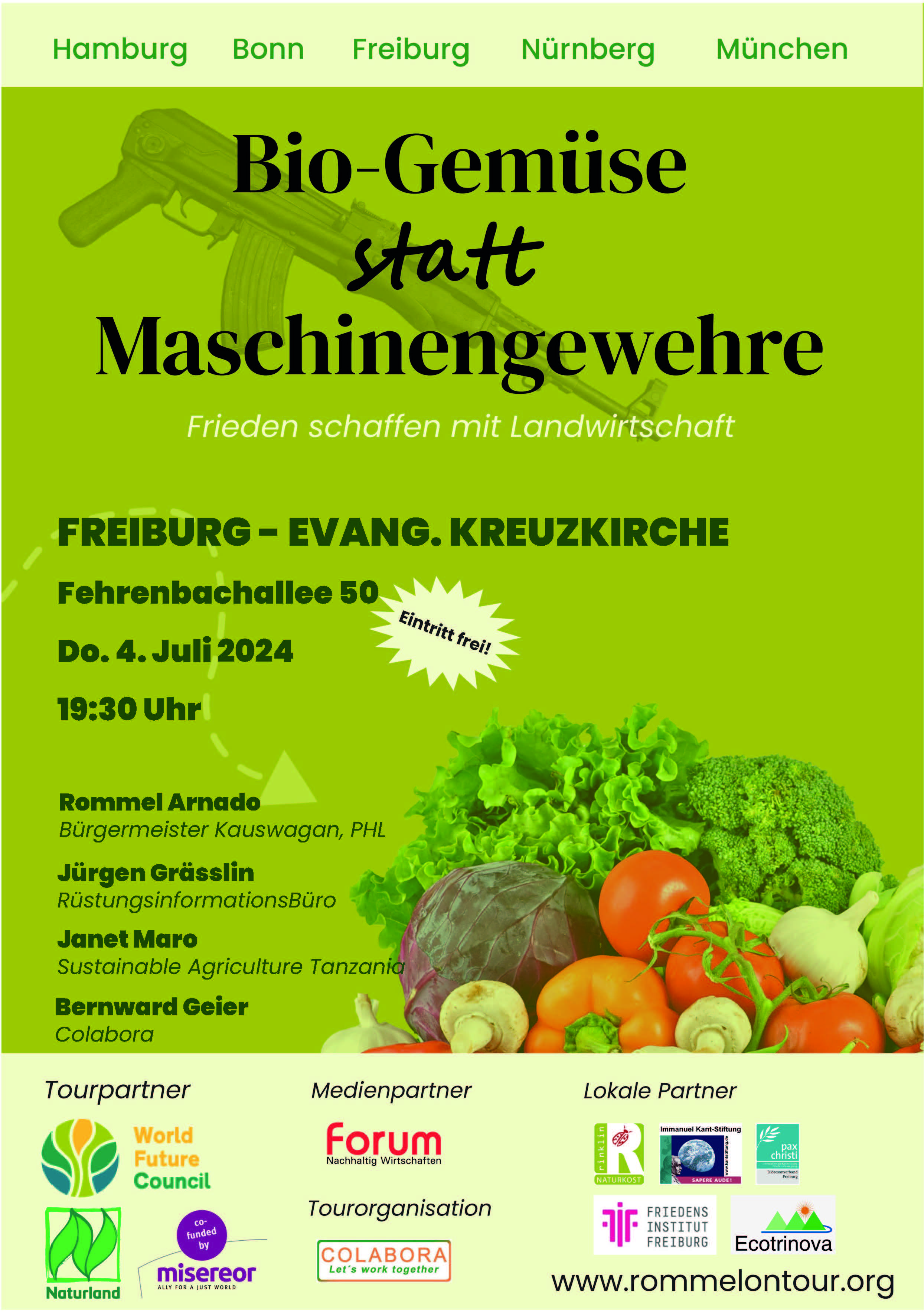 Der Bürgermeister von Kauswagan/Philippinen Rommel C. Arnado hat mit seinem erfolgreichen Projekt "From Arms to Farms" das derzeit wohl spannendste und inspirierendste Projekt im biologischen Landbau weltweit geschaffen. Vermutlich gilt das auch für die Friedensbewegung. Mehr Informationen dazu via www.rommelontour.org Im Rahmen einer zwölftägigen Tour in drei Ländern (D, NL, CH) wird Rommel Arnado auch in Bonn Station machen, was Gelegenheit bietet bei einer Veranstaltung von Rommel Arnado mehr über diese motivierende Erfolgsgeschichte zu erfahren.. Am 4. Juli wird er um 19:30 Uhr in der Kreuzkirche (Fehrenbachallee 50) einen Vortrag mit anschließender Podiumsdiskussion halten. Gastgeber ist das Friedensinstitut Freiburg der EH Freiburg, Kantstiftung, Pax Christi und Rinklin Naturkost GmbH Der Eintritt ist frei.