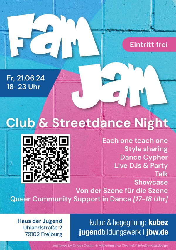 Am 21. Juni organisieren Tänzer*innen aus der Club- und Streetdance-Szene die FamJam – ein freshes Tanz Event mit Live DJs, Freestyle Session und viel Raum zum selber Tanzen.