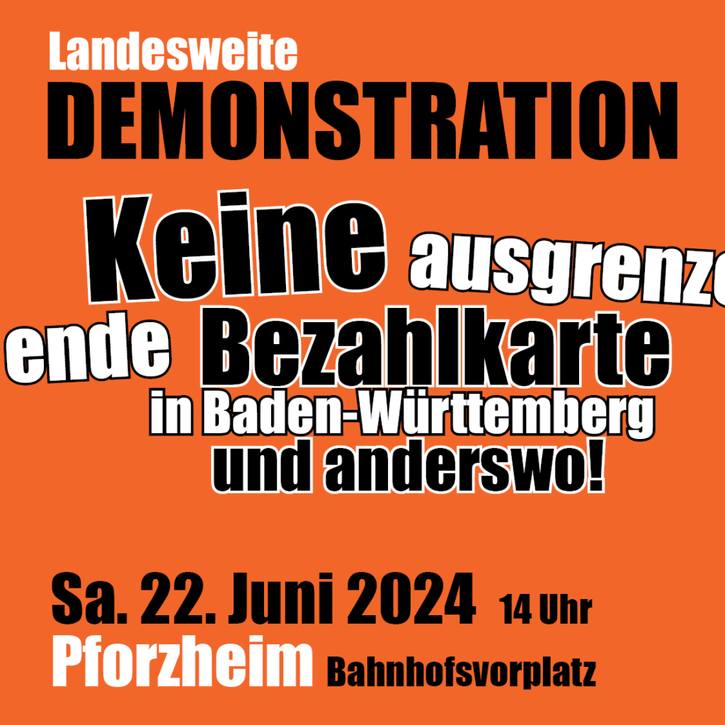 Gehen wir am 22. Juni 2024 in Pforzheim gemeinsam auf die Straße. Fordern wir neue, bessere Sozialsysteme ein. Unser Ziel muss es sein das gute Leben für alle zu erkämpfen. Dafür muss als erster Schritt das ausgrenzende Asylbewerberleistungsgesetz ersatzlos gestrichen werden. Wir rufen euch zur Unterstützung einer landesweiten Demo gegen rassistische Hetze, Bezahlkarte, Arbeitspflicht, Duldung, Asylbewerberleistungsgesetz und alle anderen Demütigungen und Entmündigungen, denen Flüchtlinge, Arbeits- und Wohnungslose ausgesetzt sind, auf.