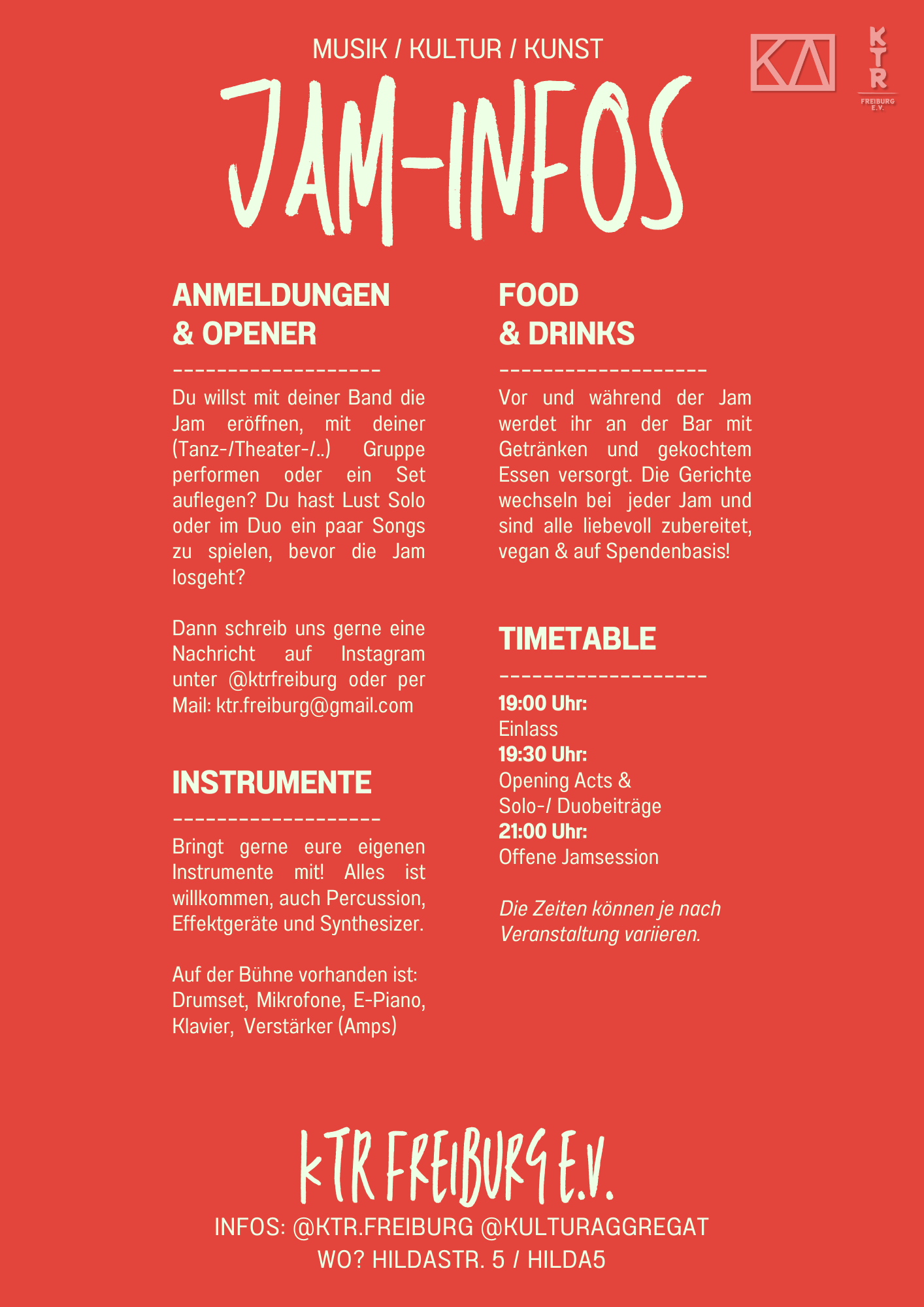 Jammsession mit Opening Acts. Dabei gibt es immer wechselnde vegane Gerichte an der Bar für wenig Geld oder auf Spendenbasis.
