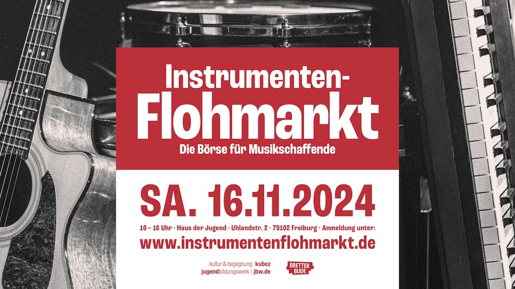 Du suchst ein neues Musikinstrument oder möchtest deines verkaufen? Dein Verein oder deine Band hat zu viel Equipment im Proberaum? Dann komm zum Instrumenten-Flohmarkt, organisiert vom Jugendbildungswerk Freiburg e.V. und Bretterbude e.V.! Ob Gitarren, Trompeten, DJ- und Bühnen-Equipment oder Synthesizer – hier findest du alles. Der Eintritt ist frei, und wir freuen uns über Spenden zur Unterstützung unserer gemeinnützigen Arbeit.