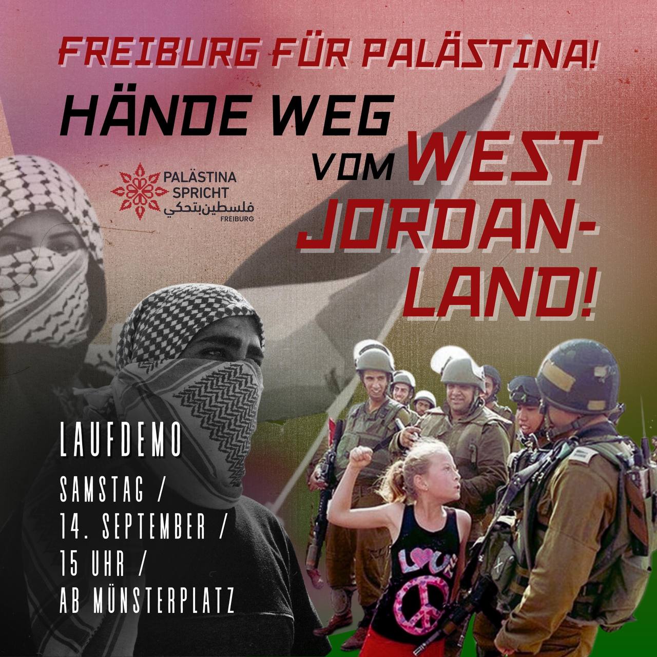Am Samstag findet unsere nächste Demo statt, diesmal unter dem Motto "Hände weg von der Westbank". Wir versammeln uns um 15 Uhr auf dem MÜNSTERPLATZ! Von dort werden wir laut, stark und vereint durch Freiburg ziehen! Teilt die Einladung und den Flyer im Anhang mit allen, die ihr kennt. Wir sehen uns am Samstag!