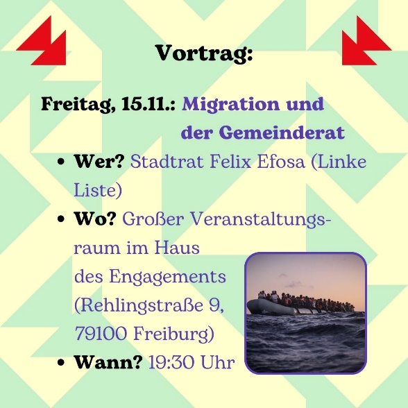Im November führen wir, DiEM25/MERA25 Freiburg, eine Veranstaltungsreihe zum Thema Migration und Integration durch. In dieser Veranstaltung der Reihe sprechen wir mit dem negewählten Stadtrat der Linken Liste, Felix Efosa, über die Migrations- und Integrationspolitik in der Stadt Freiburg. Felix ist bei der Kommunalwahl 2024 in den Stadtrat gewählt worden und sitzt dort für die Fraktion "Eine Stadt für Alle" (Linke Liste, Grüne Alternative, Unabhängige Frauen) im Integrations- und Migrationsausschuss.