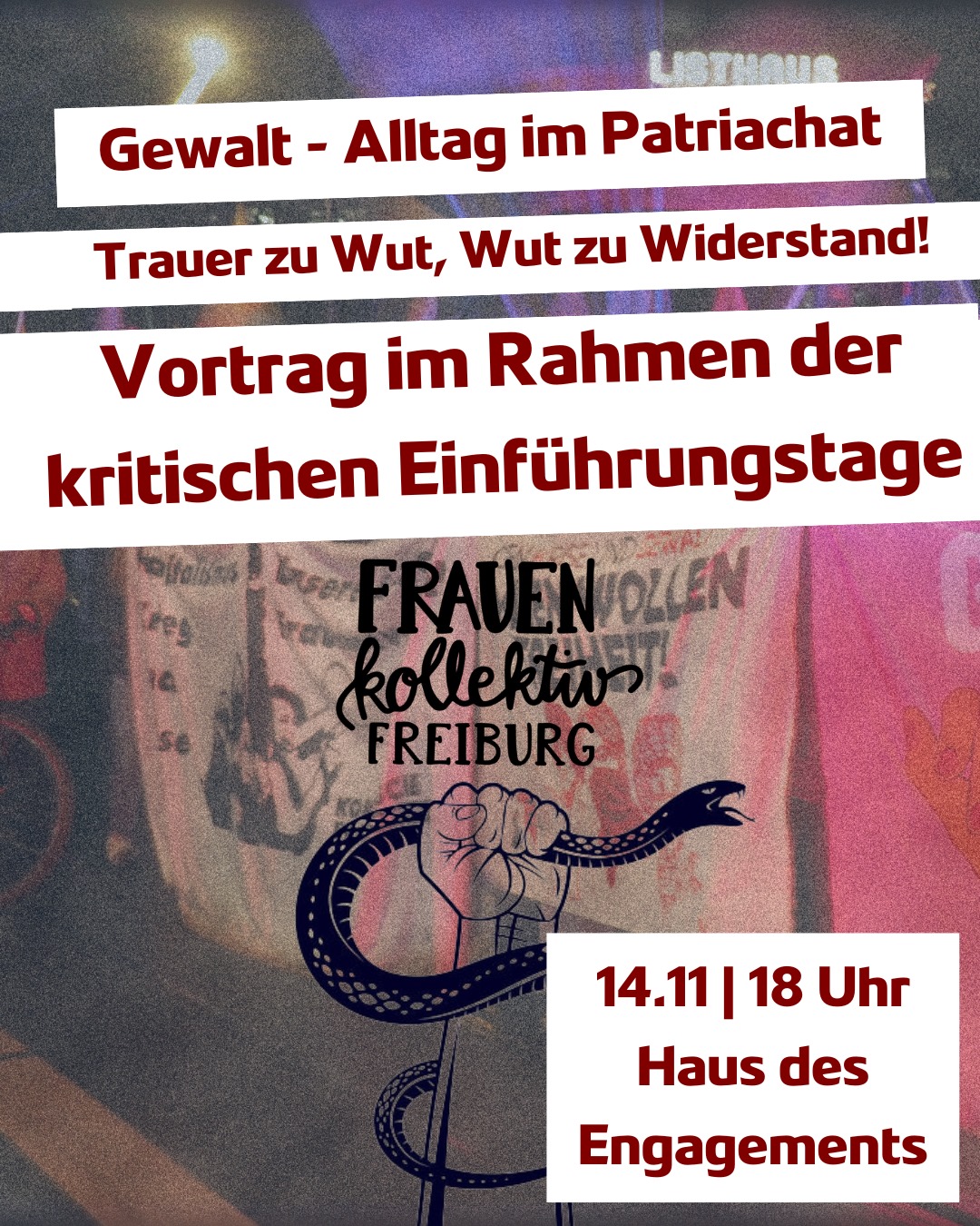 Im Rahmen der kritischen Einführungstage organisieren wir einen Vortrag zum Thema patriarchaler Gewalt und wie wir uns dagegen wehren. Kommt vorbei!